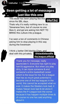 最後他貼出了一段疑似台灣球迷和他的對話截圖,對話中球迷表示,呂政儒過去再SBL時期開始就經常做出這樣的動作,該球迷認為呂政儒不應該將這樣的文化帶到PLG,並希望Tanveer能主動私訊聯盟執行長陳建州,並私下解決此事,Tanveer則回應呂政儒讓PLG和鋼鐵人看起來糟糕,因為這已經發生太多次,不過始終沒有人對此說過些什麼。