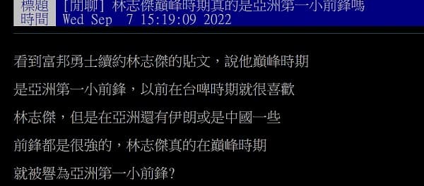 就有PTT網友在「台籃板」上發問「林志傑巔峰時期真的是亞洲第一小前鋒嗎」原PO寫到「看到富邦勇士續約林志傑的貼文,說他巔峰時期是亞洲第一小前鋒,以前在台啤時期就很喜歡林志傑,但是在亞洲還有伊朗或是中國一些前鋒都是很強的,林志傑真的在巔峰時期,就被譽為亞洲第一小前鋒?」