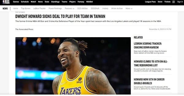 文中提及霍華德和台灣球隊簽約,並且將效力於台灣頂級聯賽的桃園雲豹隊,此外也特別介紹籃球在台灣是除了棒球之外,最受歡迎的運動,男、女子組的高中聯賽冠軍賽更是在全國轉播。