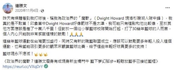 事實上連勝文的球技在政治界絕對排的上名號,他過去曾是再興高中籃球校隊,2020年本站也曾報導過一篇「政治界的魔獸?連勝文瘦身有成現身新生橋鬥牛 籃下夢幻腳步+輕鬆放籃手已接近籃框」的貼文,有幸被連勝文轉發,連勝文當時也針對此篇貼文謙虛回應「不敢當,大概只有罰球不準和霍華德有點像而已。」