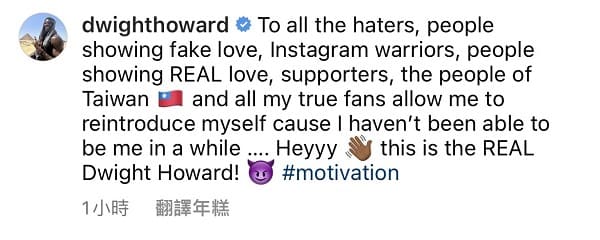 稍早霍華德就在IG曬出自己上周的精華,並寫道「致所有的仇恨者、假裝關愛我的人們、以及IG上的鍵盤俠,那些台灣的真粉絲展出對我真正的關懷並讓我重新詮釋我自己,我已經好久沒有成為真正的我了,這就是真正的Dwight Howard」值得一提的是貼文中霍華德再度附上台灣國旗。