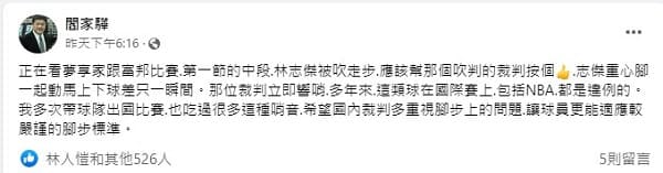 閻家驊寫道「應該幫那個吹判的裁判按個讚」閻家驊表示在林志傑重心腳一啟動下球的瞬間就已經走步「那位裁判立即響哨,多年來這類球在國際賽上,包括NBA都是違例的。」