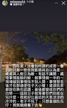 吳岱豪稍早在個人IG寫到「三、四年來,沒看到所謂的成長,看到的只有一些自我膨脹與自以為是⋯處處與人樹立為敵。有話不講開,處理事情能躲的躲、做事情做一半的~」。