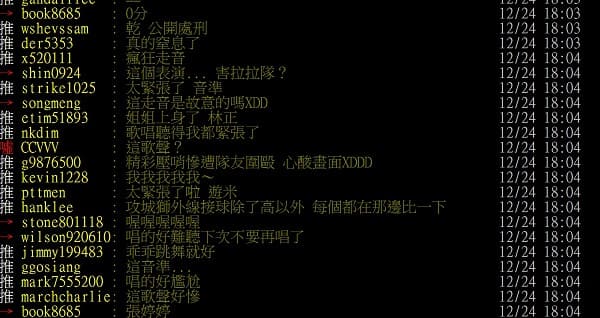 而在演唱過程中聊天室也是刷一片「中場用啦啦隊唱歌 這麼省」、「這個歌聲 有問題」、「乾 公開處刑」、「領航啦啦隊 聲音很明顯沒出來 而且冷到會自動抖音」、「是太冷還是太緊張」、「靜音用看的就好」。