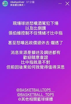 另外根據NBA自媒體「NBAYOLIVER」IG貼文「現場球迷怒噴酒駕犯下場以及比倒讚,張伯維控制不住情緒才比中指。」