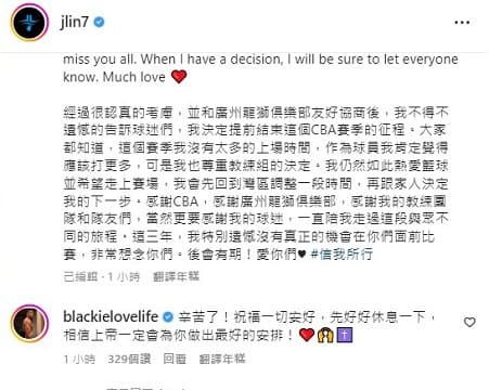 根據媒體報導,在林書豪宣布離隊後,身為好友兼PLG執行長的陳建州也留言表示「辛苦了!祝福一切安好,先好好休息一下,相信上帝一定會為你做出最好的安排 !」