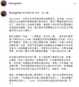 「做為夢想家的鐵血球迷也是你的好朋友,我想謝謝你這三年多來為球隊打造出來的強悍文化,謝謝你,教練」陳立宗寫到。