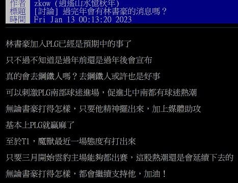 日前有網友在PTT「台籃板」上發文寫道「過完年會有林書豪的消息嗎?」文中提及「林書豪加入PLG已經是預期中的事了,只不過不知道是過年前還是過年後會宣布,真的會去鋼鐵人嗎?」