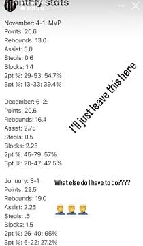 而牧倫斯稍早貼出自己本賽季每一個月份的單月成績,並寫到「我就把這個貼在這裡」,其中在1月他場均能繳出22.5分、19籃板、2.2助攻、5抄截、1.5火鍋,數據是完全壓過盧峻翔,另外國王隊本月份成績為3勝1敗,球隊戰績為聯盟第一。