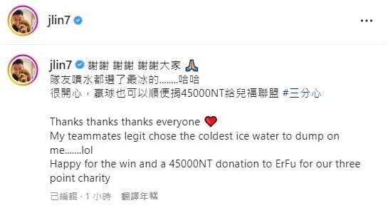 比賽結束後林書豪開心發文「謝謝、謝謝、謝謝大家,隊友噴水都選了最冰的........哈哈,很開心,贏球也可以順便捐45000NT給兒福聯盟。」