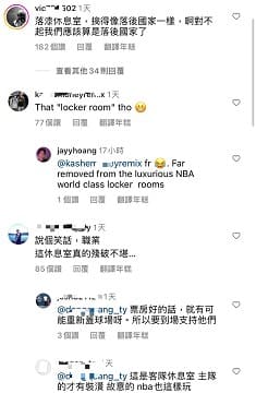 由於林書豪的IG擁有195萬名粉絲追隨,因此影片一發布立刻引發討論,有網友就說到「落漆休息室,搞得像落後國家一樣,啊對不起我們應該算是落後國家了」、「說個笑話,職業」、「這休息室真的殘破不堪… 太窮酸了這休息室。是在打系籃嗎?」、「好破的球員休息室…」。