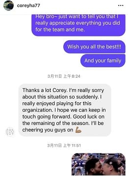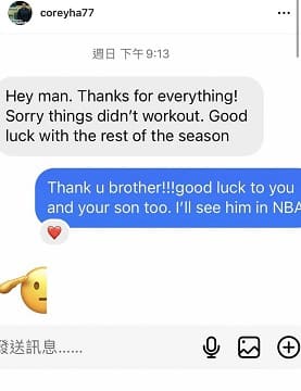 而在上週末大勝就已經決定離隊,並私訓和哈總告別「嘿,兄弟。謝謝你所做的一切!抱歉,事情沒有解決。祝本賽季剩餘的比賽順利」,而哈孝遠則回應「謝謝你兄弟,祝你和你的兒子一切順利,也希望能看到你在NBA打球。」