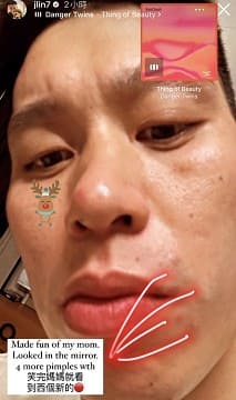 隨後林書豪又貼出自己的臉部特寫照,照片中林書豪的右臉長了四顆大痘痘,他寫道「笑完媽媽就看到四個新的。」