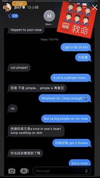 林書豪昨日在個人IG貼出自己鼻子上大痘痘的照片,隨後又貼出自己和媽媽吳信信的私訊截圖。