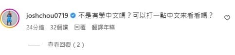 而周桂羽也在貼文底下留言「不是有學中文嗎?可以打一點中文來看看嗎?」