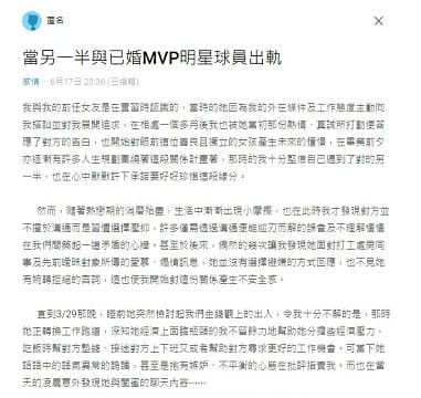 今日有網友在「D-CARD」上發文寫到「當另一半與已婚MVP明星球員出軌」,文中直接點名新北國王球星楊敬敏和自己的女友出軌,並貼出一系列楊敬敏主動私訊女方的對話。
