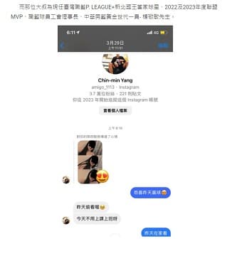 貼文一出立刻引發網友熱議,而本站也恰巧在去年曾接獲某現役籃球員前妻爆料,並貼出楊敬敏主動傳LINE訊息的一系列對話截圖,截圖中的對話意圖引人遐想,時間點約落在2020年3月,這名過去曾和知名球員有過婚姻的女性友人事後回想表示「當時楊敬敏約我的時候,我也有跟一樣是球員的老婆求救,表示困擾,他們都選擇沉默,因為他們的老公想進聯盟,沒人想得罪他,我當時超生氣的」。