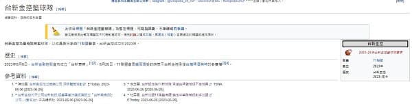 而就在剛剛台新金控籃球隊的維基百科也悄悄上架,球隊資訊則寫下「台新金控是臺灣職業籃球隊。2023年6月6日,台新金控成立育樂公司。6月26日,T1聯盟會長錢薇娟表示,台新金控承接台灣啤酒英熊的參賽權。」
