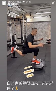 今日他在社群曬出自己的訓練畫面,鏡頭中他右腳踩著器具,維持平衡訓練核心和平衡,他的訓練師也寫到「越來越穩了」,周儀翔則分享動態寫下「自己也感覺得出來,越來越穩了」,看的出來狀態已經慢慢回到過往。