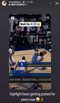 威廉斯稍早在個人IG分享知名社群「rkls_edits」的影片,影片主角正是他本人,在一場面對灰狼的比賽,威廉斯面對三名防守者,一人從外圍持球,直接啟速,在禁區做了一個假晃的動作,直接將灰狼三名球員晃飛,隨後在籃下輕鬆擺進。