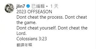 林書豪今日在個人IG貼出自己的訓練照,並寫到「不要欺騙過程,不要欺騙比賽,不要欺騙自己,不要欺騙上帝」。