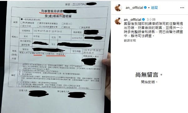 此外今日林子安又曬出一張報案單,內文清楚提及已向許姓男子提告恐嚇、妨害自由,林子安寫到「案發後我隨即就請律師陪同前往警局提出恐嚇、妨害自由的報案,並提供1小時多完整錄音和錄影,現已由警方調查中,靜待司法調查。」