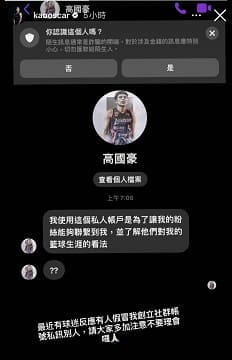 PLG職業籃球聯賽,新竹攻城獅一哥高國豪此前因球鞋爭議鬧的狒狒揚揚,沒想到近日竟出現有心人士,有意利用高國豪的知名度在網上詐騙,高國豪也第一時間發文澄清該帳號並非本人所有。