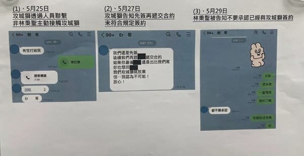 另外林秉聖也在季者會後提供自己和攻城獅相關人員的對話,攻城獅相關人員寫到「我們還是先簽,後續我們在跟XX遞交合約,如果你最後XX還是出比我們高,你也想回XX,我們攻城獅就放棄...我認為不可能!放心」,此外對話中也能看到5月29日攻城獅GM張樹人曾告知林秉聖,不要承認已經和攻城獅簽約一事。