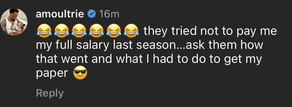 而在剛剛球隊前洋將莫爾特里直接在聯盟IG底下留言寫道「上季他們本來還不想付我全額的薪水…問問他們後來發生什麼事以及我怎麼處理才得以拿到我的錢。」