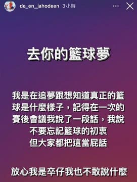 趙得恩稍早在個人IG悲痛寫到六個大字「去你的籃球夢」,接著他寫到「我是在追夢跟想知道真正的籃球是什麼樣子,記得在一起的賽後會議我說了一段話,我說不要忘記籃球的初衷,但大家都把這當屁話。」
