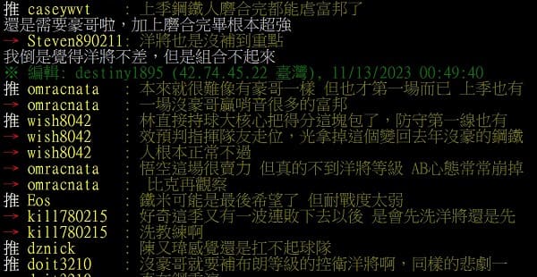 對此網友也紛紛留言發表看法「有林跟沒林 防守差蠻多的」、「林書豪的攻防跟台籃完全不同等級」、「林直接持球大核心把得分這塊包了,防守第一線也有效預判指揮隊友走位,光拿掉這個變回去年沒豪的鋼鐵人根本正常不過」、「悟空這場很賣力 但真的不到洋將等級 AB心態常常崩掉 比克再觀察」、「陳又瑋感覺還是扛不起球隊」、「教練再厲害也是在場下,怎麼比的上在場上先幫隊友至少吸走兩名對手的球員」。