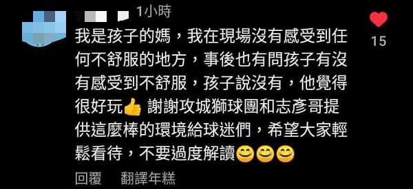值得一提的是這位小球員的媽媽也在社群留言,並表示自己和小孩都沒有感受到不舒服,小孩甚至覺得很好玩,也特別感謝林志彥提供如此棒的環境給球迷,希望獅迷不要過度解讀。