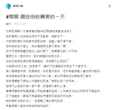 他寫道「今天這場確實把我的心態打崩了,撇開第三節八分不說, 整場三分一度20中0,且失誤達到22個之多, 拚勁也與領航猿球員相差甚多,洋將更不必多說了, 比克跟AB可以包一包回家了,真的不知道這支球隊出了什麼狀況。」