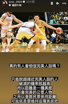 在富邦和國王的比賽結束後,TVBS知名女記者張良瑜在個人IG發文,並放上一張林書豪對陣桃園領航猿的照片寫到「真的有人會相信完美人設嗎?只能說越接近完美人設的人,破滅的機率就越高,所以距離是一種美感,形象完美的公眾人物,之所以會跟民眾保持距離,可能就是要維持這種美感吧。」