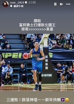 隨後他又放上一張林至結的照片寫到「讚啦,富邦勇士打爆新北國王,傑哥>>>>>>>某豪,三連敗!跌落神壇~~新年快樂。」