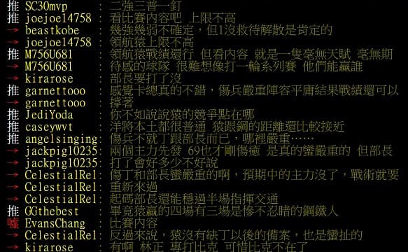 另外也有網友直言「畢竟猿贏的四場有三場是慘不忍睹的鋼鐵人」,也有網友寫道「目前內容要進季後賽有點抖吧 夢想家 國王 勇士 難度不低,現在的工程師的DD還沒入隊 要抓下來也是頗難」。