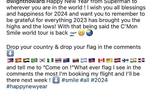 霍華德昨日在個人IG發文,並預祝所有球迷新年快樂,還放上17個國家的國旗,可是卻沒有台灣。