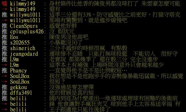 「防守不太行,三分也骰,3D先做好吧 三分手感好的時候很瘋 有點骰」、「運球慘不忍睹 只能打無球投籃 不能切入 很好守」、「老實說 都第幾季了 還在骰三分 完全沒進步」、「這季本土有補強 上場時間沒意外只會越來越少」、「那年真狀元是謝亞軒跟阿巴西 有謝可選 哪會選他==」、「時間到就可以去SBL了,沒防守、無法處理球、三分骰、球商低,我是不曉得合約到了以後有什麼理由職業隊要簽他啦。」