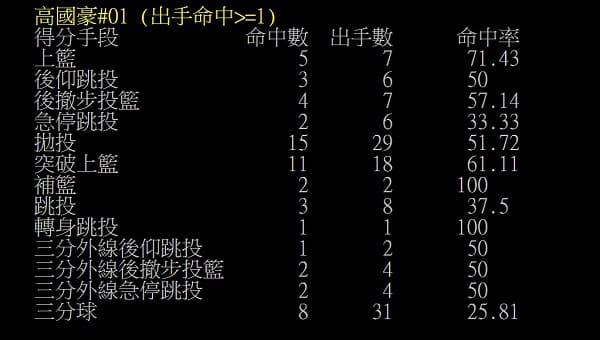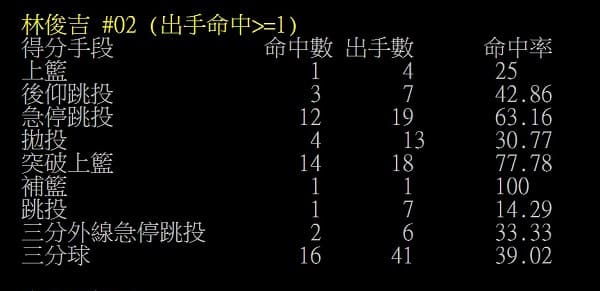 而除了高國豪之外,原PO也整理出另一位聯盟一線後衛林俊吉的進攻招式列表,相較於高國豪,林俊吉的進攻手段少得多,主要進攻手段為突破上籃、三分球和急停跳投,不過命中率同樣相當不錯,而盧峻翔、陳又瑋等人進攻手段同樣貧乏,且命中率也不理想。
