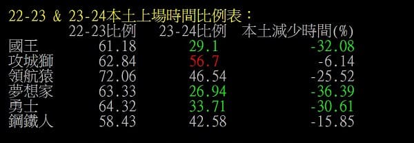 除了夢想家之外,新北國王也是不遑多讓,本季本土上場比重從61%掉到29%,本土球員場均上場時間足足少了32分鐘,也是聯盟調整賽制後本土被影響最大的球隊之一。