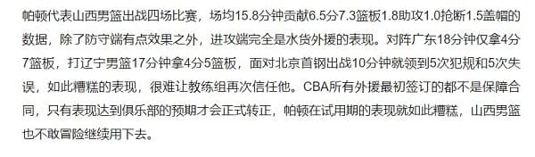 此外沛登在21年被下放到發展聯盟,還曾打出單場45分的統治級數據,比較令人擔心的是在沛登徹底離開NBA後,本季曾在中國CBA效力山西隊,場均僅10.3分、7籃板、1.8助攻、1.5火鍋,最後只打了4場比賽就被釋出,當時被中國媒體戲稱「除了防守端有點效果之外,進攻端完全是水貨外援的表現」,其中在北京的比賽中僅出賽10分鐘就拿到5犯、5失誤,平心而論以沛登在NBA的能力不應在CBA只打出這樣的成績,也希望他能在台灣重新證明自己。
