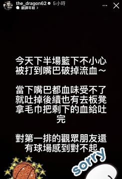 他表示「當下嘴巴都血味受不了,就吐掉,後續也有去板凳拿毛巾把剩下的血給吐完,對第一排的觀眾朋友還有球場感到對不起。」