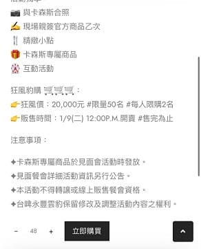 雲豹將在1月29日於桃園喜來登酒店為卡森斯舉辦見面餐會,參加餐會的球迷不只能和卡森斯合照,還能拿到卡森斯的專屬親簽商品,以及一份精緻小點,活動內容相當吸引人,不過要價新台幣兩萬元讓不少球迷卻步。