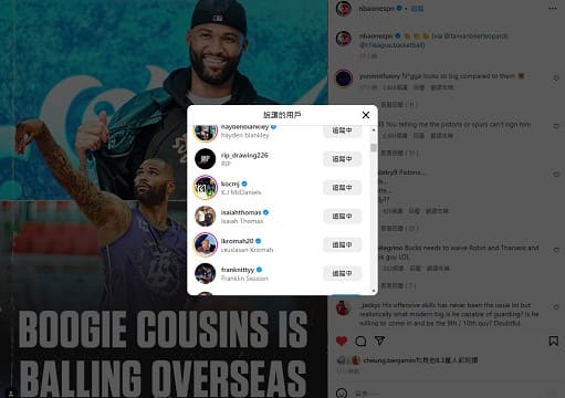 而在貼文底下也有大批外國球迷留言,並認為表弟仍有在NBA生存的能力「你告訴我活塞或馬刺為什麼不能簽他」、「活塞...巫師...夏洛特...沒有人??」、「公鹿需要放棄羅賓和塔納西斯並簽下這個傢伙,哈哈」、「盡快把兄弟送去活塞」,不過也有外國球迷認為「他的進攻技巧從來不是問題哈哈,但現實地說,他有什麼能力能夠在現代生存?他願意進來當第九/第十個傢伙嗎? 懷疑」。