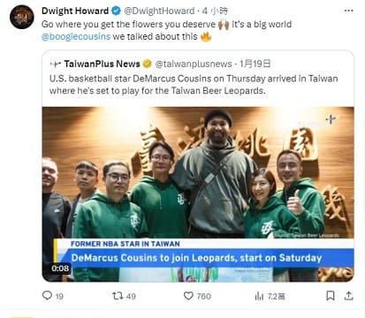 霍華德稍早分享卡森斯來台球迷接機的影片,並寫到「這個世界很大,去你應該得到掌聲和球迷支持的地方,我們曾經聊過這個」。