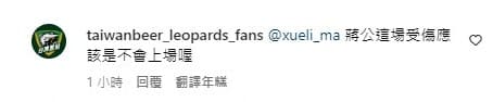 根據此前報導克羅馬因腿後肌拉傷的問題「大獅賽」能否上場還是未知數,不過稍早球隊官方也正式宣布,克羅馬不會在這場比賽中亮相,雲豹官方IG在貼文底下回應網友「蔣公這場受傷應該是不會上場喔」。