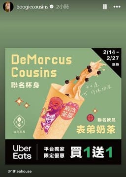卡森斯在今日特別分享網紅TOYZ旗下飲料店拾汣茶屋的資訊,貼文中拾汣茶屋正在促銷旗下飲料「表弟奶茶」買一送一的資訊。