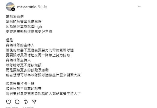 他最後也寫到「如果只是打卡上班,如果只想主持贏的球賽,那只要敢拿麥克風會說話的人都能當著主持人了。」