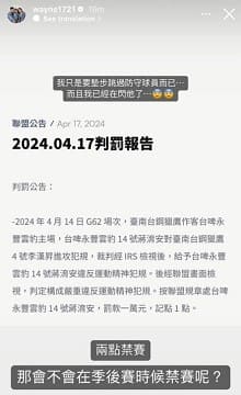 而在昨日聯盟做出懲處,蔣淯安因為嚴重違反運動精神犯規,遭到罰款一萬元,另外加記點1點。