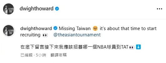前台籃洋將「魔獸」霍華德昨晚突然在社群對台灣事好,他表示自己開始想念台灣,疑似在為回台打球做打算。
